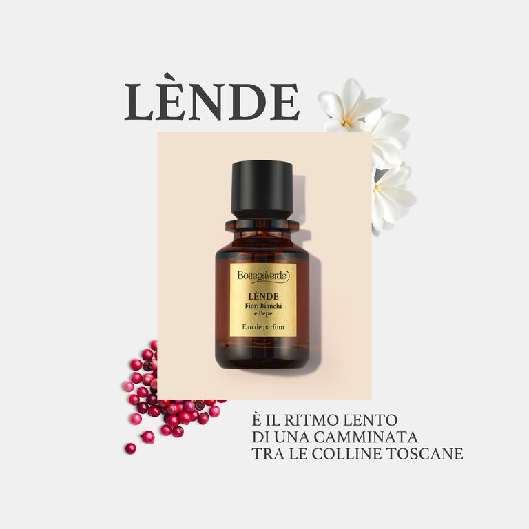 In Toscana "Andare lènde lènde" significa camminare senza fretta, lasciando che ogni cosa trovi il suo tempo. Significa imparare a cogliere la bellezza che si svela piano, come il profumo della terra al primo sole del mattino. È un invito a fermarsi, ad ascoltare il silenzio pieno dei campi, a godere delle piccole cose che fanno grande ogni giornata. Lende è tutto questo. È la fragranza che racconta la bellezza essenziale e autentica, quella che si rivela senza bisogno di apparire.Il suo bouquet di fiori bianchi, morbido e luminoso come una carezza di petali appena schiusi, si apre delicato, come un gesto spontaneo, leggero come un sorriso che sa di verità. Il pepe, sottile e vibrante, attraversa la composizione con la stessa leggerezza del vento che muove le foglie nei pomeriggi d'estate, lasciando nell'aria una scia discreta ma viva, capace di sorprendere senza mai spezzare l'armonia. Lende nasce proprio da qui, da questo ritmo lento e pieno, che appartiene a chi vive ogni cosa senza rincorrerla.